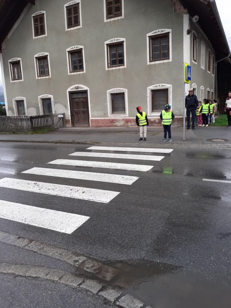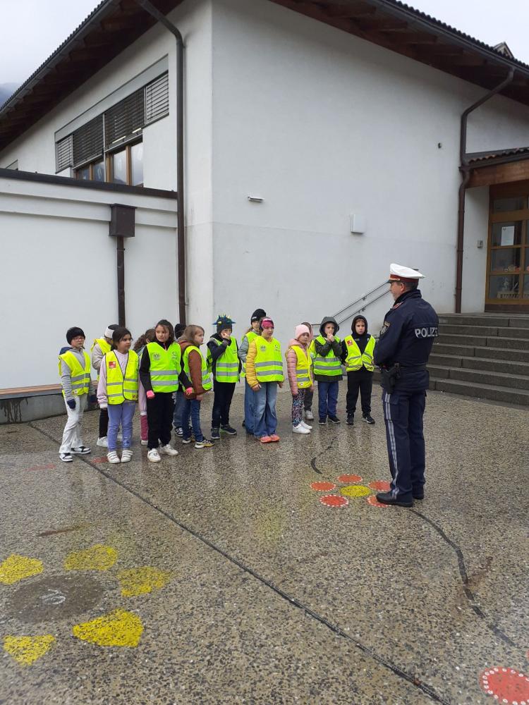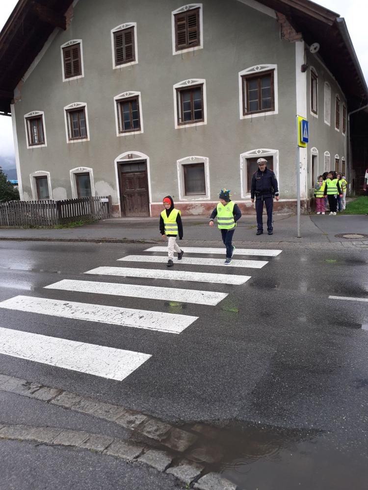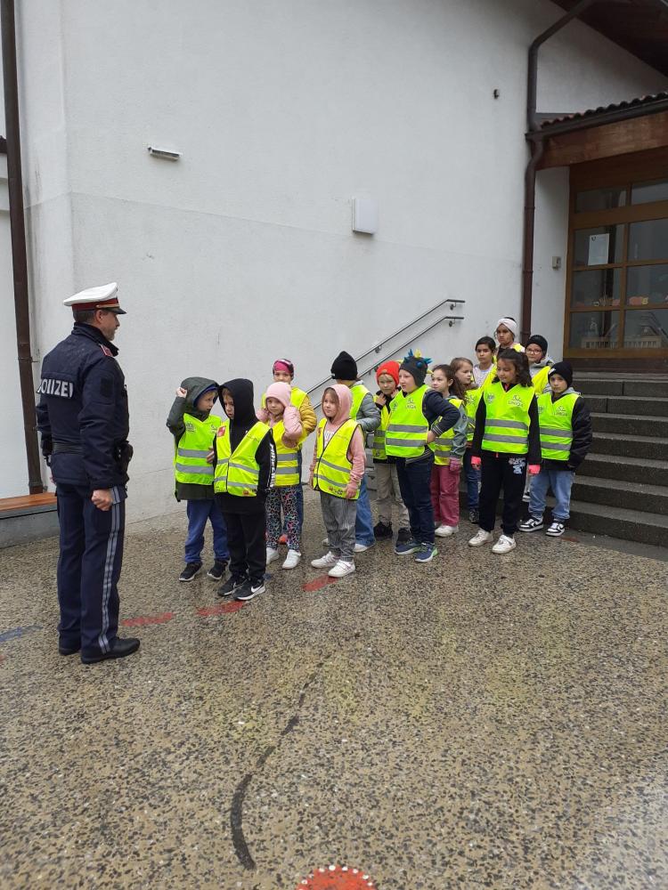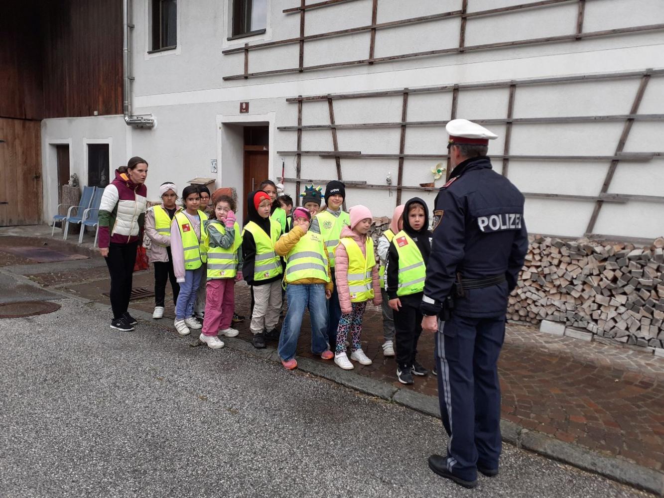Anfang Oktober besuchte uns die Polizei. Gemeinsam gingen wir zur Landesstraße, um dort das Überqueren zu üben. Auch einige Verkehrsregeln, sowie Tipps für den Schulweg konnten wir uns vom Polizisten Sascha abholen.
